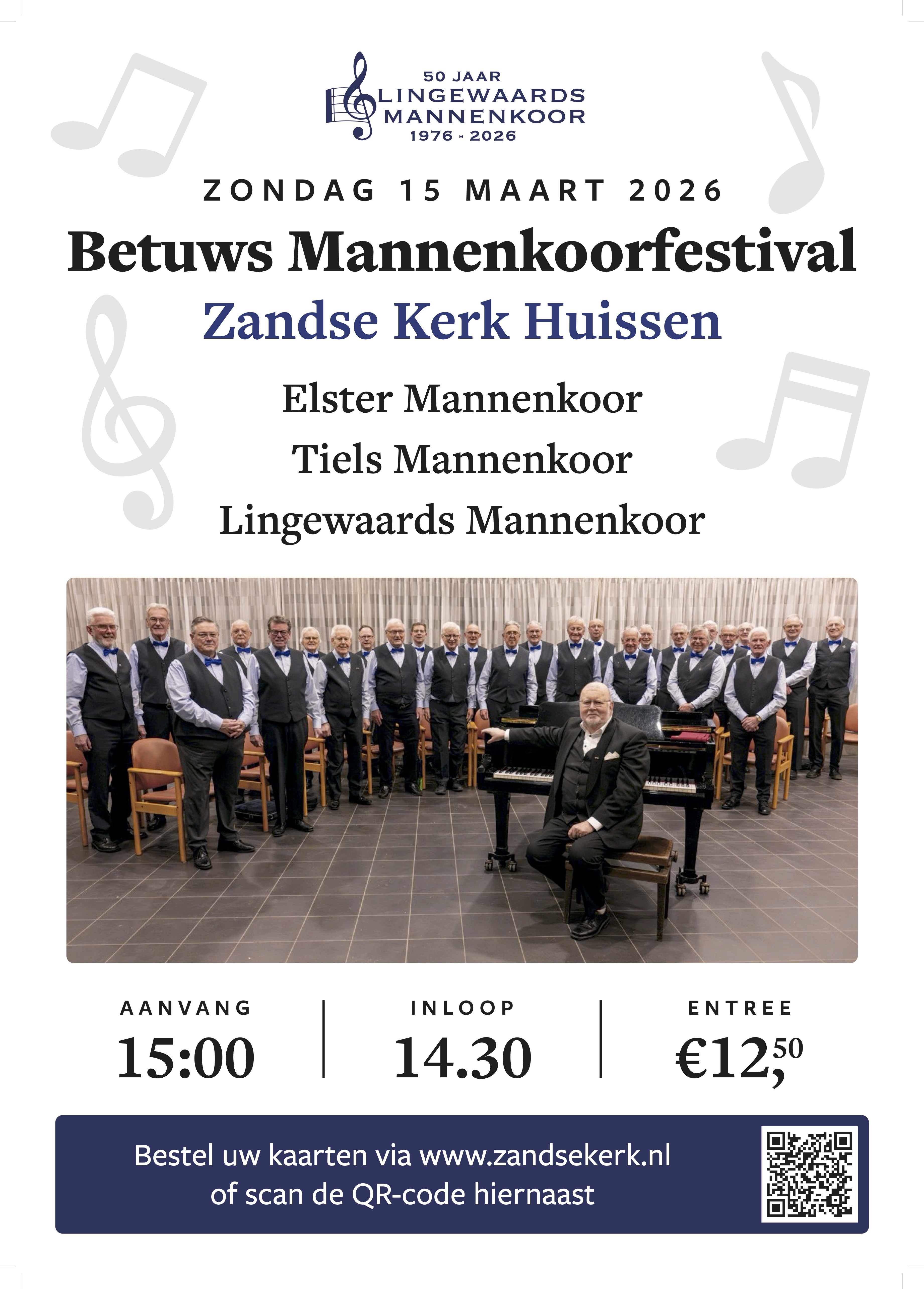 Het Lingewaards Mannenkoor viert dit jaar haar 50 jarig jubileum. De start van het jubileumjaar is het mannenkoorfestival op zondag 15 maart 2026 om 15:00 uur in de Zandse kerk (van Wijkstraat 33) in Huissen. Een festival met een Betuws tintje, met optredens van drie Betuwse Mannenkoren, het Tiels Mannenkoor, het Elster Mannenkoor en het Lingewaards Mannenkoor.